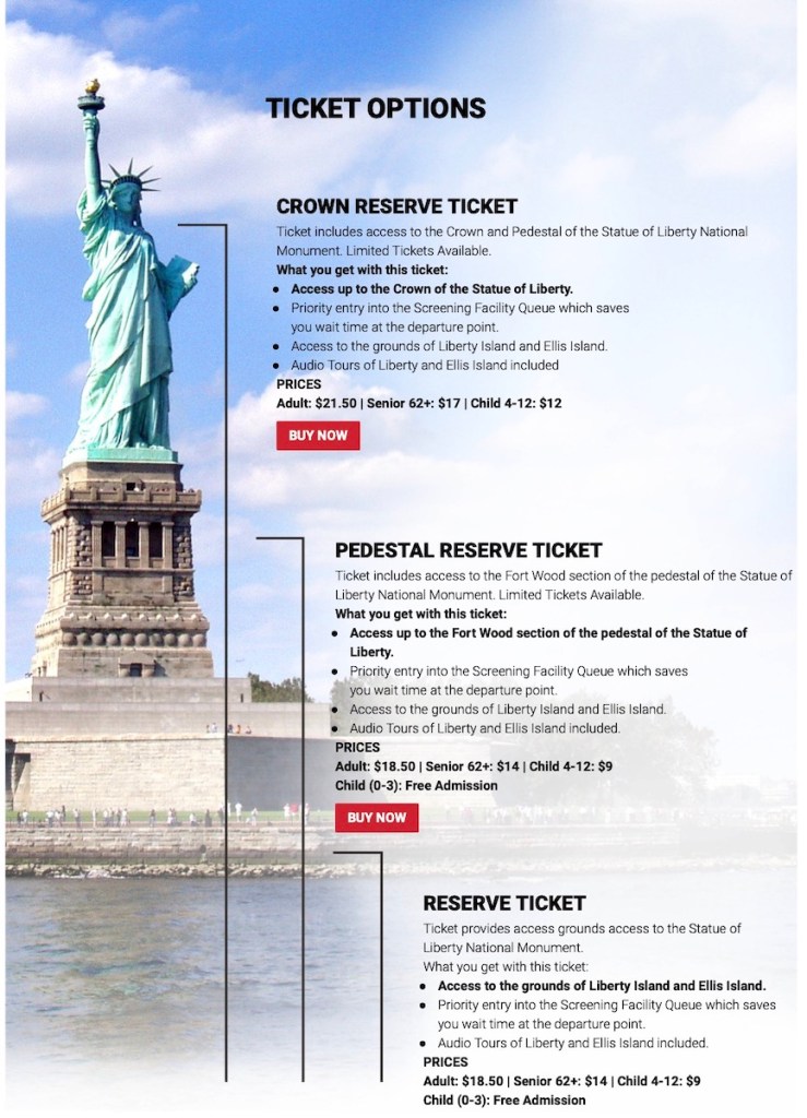 การเดินทางมาที่เกาะลิเบอร์ตี้แห่งนี้คือนั่งเรือ ซื้อตั๋วเรือ Statue Cruises จุดขึ้นเรือมีทั้งแบบ ออกจาก New York และ New Jersey โควต้าตั๋วเรือแยกกัน โดยตั๋วเรือมีหลายแบบเช่นกัน เช่น แบบ Crown Reserce Ticket เดินชมภายในฐานของเทพีเสรีภาพ และก็ขึ้นไปชมวิวที่มงกุฎด้วย ตั๋วมีจำนวนจำกัด ต้องจองล่วงหน้าหลายเดือน และต้องขึ้นบันได 162 ขั้น ไม่มีลิฟท์ หรือแบบ Pedestal Reserve Ticket เดินชมภายในฐานของเทพีเสรีภาพค่ะ นอกจากนี้ ควรไปล่วงหน้า 1 ชม. เพราะต้องผ่านขั้นตอนการตรวจกระเป๋าอย่างเข้มงวด เผื่อเวลาเที่ยว 2-3 ชม. นะคะ เราจะได้ชมวิวอันสวยงามของอ่าวแมนแฮตตัน และวิวอาคารสูงๆ ของเมืองนิวยอร์ก ที่เกาะจะมีจุดชมวิวพร้อมจุดถ่ายภาพกับรูปปั้นแบบชัดๆ เต็มๆ ตา เลือกเล็งมุมกันได้ตามใจชอบเลยค่า ^^ แถมบริเวณรอบๆ ยังมีร้านค้า ร้านอาหาร คาเฟ่ ร้านขายของที่ระลึก และพิพิธภัณฑ์ให้นักท่องเที่ยวได้ชมได้ช้อปกันอีกด้วยค่ะ