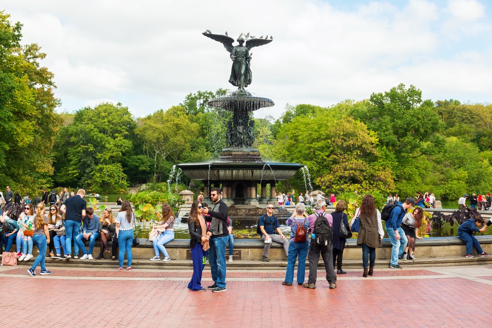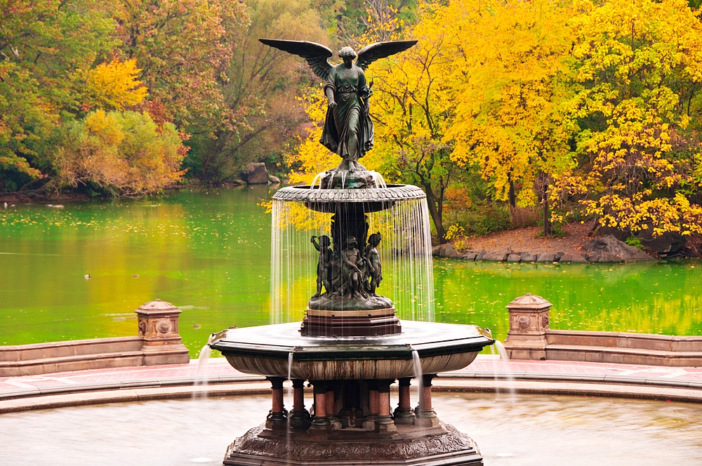ภายในสวนยังมีสถานที่แจ่มๆ ให้ได้ชมและถ่ายรูปเพียบเลยค่ะ จุดแรกคือ น้ำพุ Bethesda Fountain เรียกได้ว่าเป็นแลนด์มาร์คของสวน ใครมาก็ต้องมาแวะแชะภาพกันตลอด ตรงกลางมีรูปปั้นนางฟ้าสูง 8 ฟุต ที่เหมือนกำลังให้พรและพลังแก่ทุกคน เนื่องจากตอนนั้นเป็นช่วงที่มีโรคระบาดหนัก จึงสร้างขึ้นเพื่อเป็นกำลังใจของคนในเมือง โดยชั้นล่างเป็นเทวดาเด็ก 4 ทิศ หมายถึง ความสมดุล ความบริสุทธิ์ ความสงบสุข และสุขภาพดี